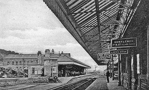 The original station at Hebden Bridge dated from the opening of the railway on 5 October 1840. Until 1 January 1841 it was the western terminus of the line from Leeds and Normanton; on this date the line was extended through Eastwood and Todmorden to the northern end of the Summit Tunnel. From 1 March 1841, when the line through the tunnel was opened to meet the existing rails from Manchester, trains used the entire route through Hebden Bridge between Manchester and Leeds. At Hebden Bridge the building was on the down (Leeds-bound) platform, of two storeys aligned at right angles to the platform and with a pitched roof which prominently overhung the gables, rather in the style of some G T Andrews buildings on the York & North Midland Railway. A goods warehouse was placed to the north-west of the platform. On the up platform there were no facilities, but a single-road engine shed backed onto it. The first timetable (when Hebden Bridge was the western terminus) showed departures to Leeds at 8.00 and 11.30am and at 3.15pm; arrivals from Leeds were at 9.36 and 11.50am and 4.50pm. At Normanton passengers could change for York, Hull, Sheffield and Derby and from there to Birmingham and London. A horse-drawn coach conveyed passengers to and from Littleborough pending the completion of Summit Tunnel.
