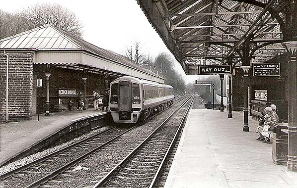 DMU 158 910 is calling at the up platform of Hebden Bridge station in April 1996