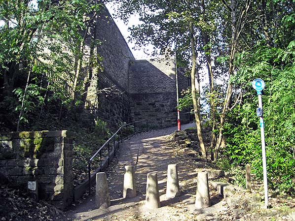 Pedestrian access to Hebden Bridge station from Palace House Road, looking north-west in October 2016. The main building is carried on an ‘undercroft’ in the foreground as it extends onto an embankment.