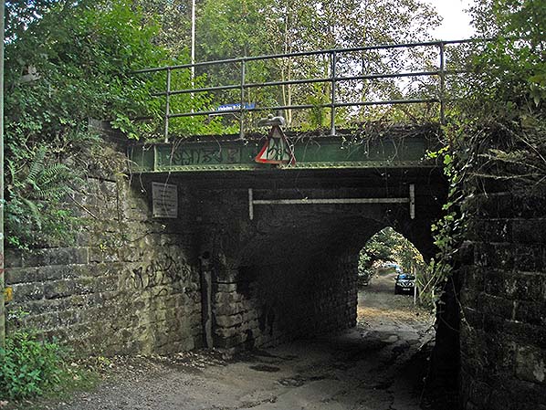 Palace House Road passes under the down platform of Hebden Bridge station. A ‘Northern’ nameboard on this platform can be seen in this northward view in October 2016.