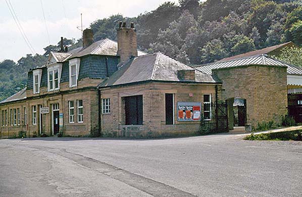 The frontage of Hebden Bridge station looking south in July 1980. The sandstone structure has been cleaned to remove almost a century’s accumulation of grime. The design is given a certain distinction by the unusual Mansard roof pierced by three dormers. The square opening at the near end of the building gave access to the parcel office; today (2016) this section of the building is a café and the opening has been adapted to form a window while a doorway has been added immediately to the left.