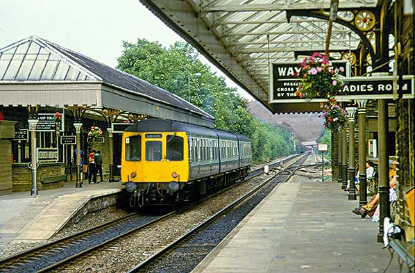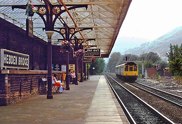 On 21 July 1984 a Class 110 DMU ‘Calder Valley’ set to Leeds is calling at Hebden Bridge. The station has a fine array of pre-Grouping signs as well as an attractive floral display.