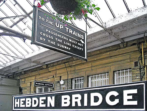 In August 2009 Hebden Bridge station’s down platform retains its Lancashire & Yorkshire Railway signage, now repainted in black and white – but the reverse of the livery seen in 1978.
