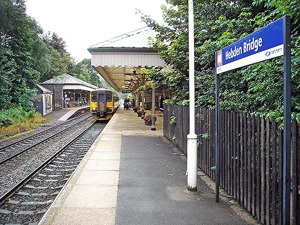 A general view of Hebden Bridge station looking north-west from the down platform on 18 August 2009. DMU 150 203 is the 10.28 departure for Manchester Victoria.