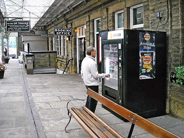 Amidst the Victorian structures and fittings at Hebden Bridge, this 21st century vending machine may be attractive to this hungry or thirsty passenger, but visually it jars with its surroundings. The photograph is on the down platform on 1 August 2009.