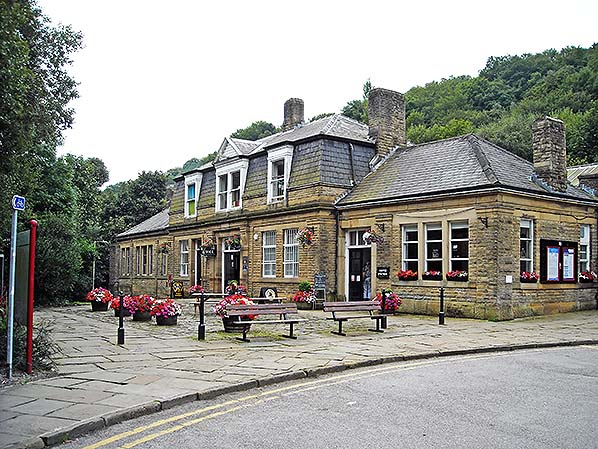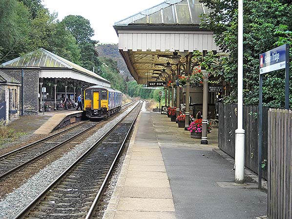 The frontage of Hebden Bridge station looking south on 18 August 2009. The forecourt, formerly a roadway, has been paved with flagstones and given seating and floral decoration; the visual improvement is enormous. The former parcel office in the single-storey wing (right) has been converted into a café, involving the installation of a new doorway and alteration of the nearest