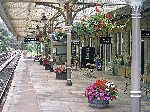 The down platform of Hebden Bridge station in August 2009, looking north-west under the glazed roofing. This is a wonderful, timeless scene (apart from the vending machine!) which welcomes visitors to the town.