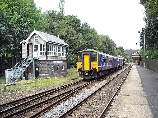 On 18 August 2009 DMU 150 203 is entering Hebden Bridge station on its way to Manchester. The signal box was constructed by the Lancashire & Yorkshire Railway in 1891 and, together with the passenger station which was rebuilt at the same time it enjoys Grade II listed status. The stairs and lavatory projecting from the box are recent additions; the external design of the lavatory is sensitive and looks as if it was part of the original structure.