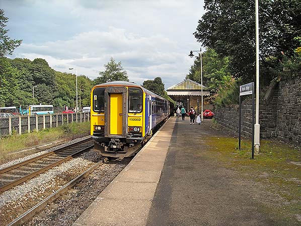 Looking south-east at Hebden Bridge station on 18 August 2009. DMU 153 352 forms the 17.08 departure for Manchester Victoria.
