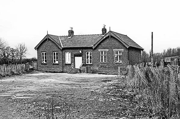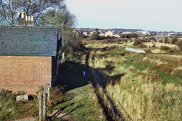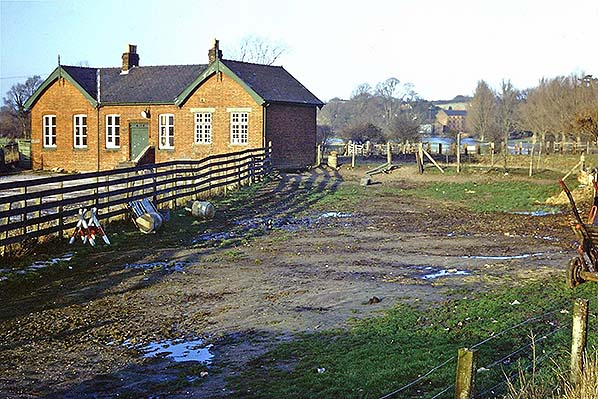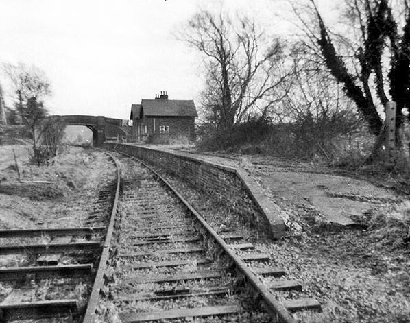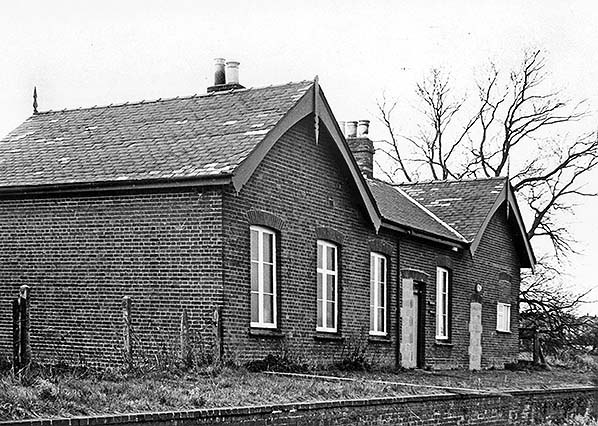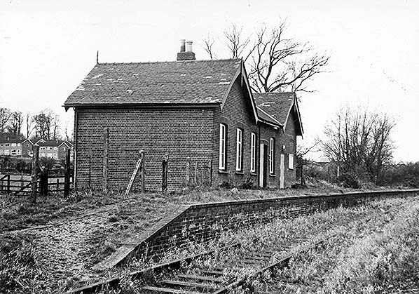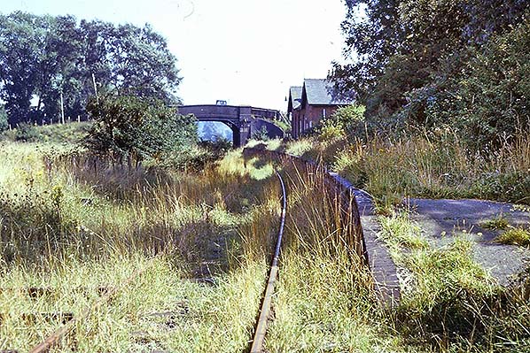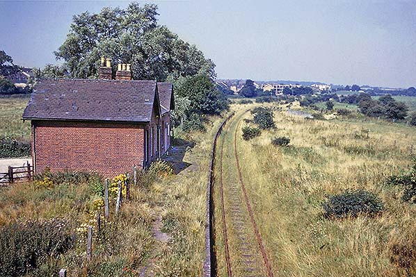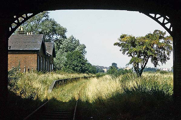 Photo by John Mann ![]() Hellesdon station seen from the trackbed in 1973 four years after closure. The station building was still occupied at the time. The fencing seen on the platform a year earlier has now been removed.