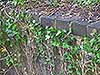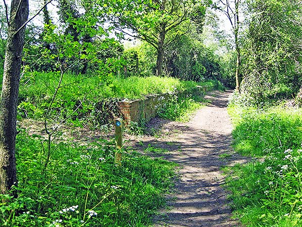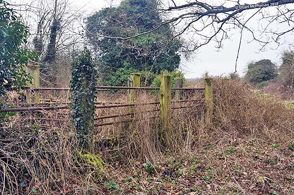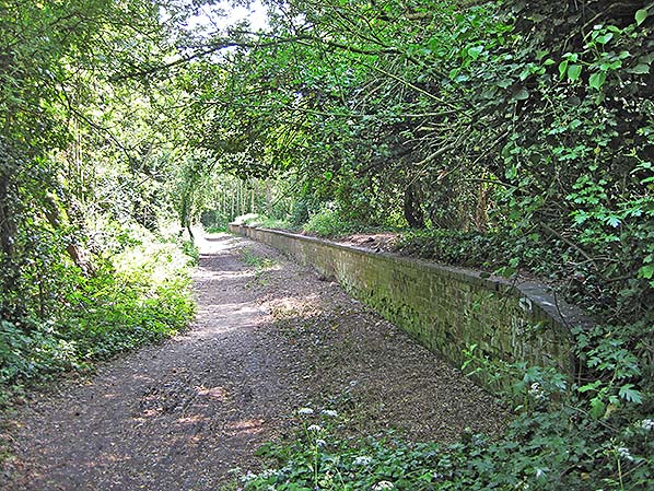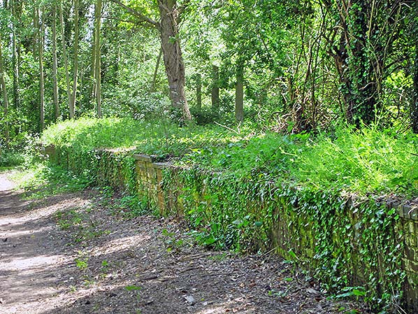 Photo by Glen Kilday Looking south along the platform face at Hellesdon on 11 May 2018: overgrowth had taken over again after work in past years to uncover the remains of the station. The station building stood beyond the larger tree near the name-board posts.