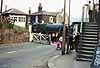 opened a railway museum at Helmshore station on 16th August 1969. At this time the track was still in situ, and, with a view to reopening the line, an offshoot of the HDRPS called the East Lancashire Light Railway Company (ELLRC) was established. Unfortunately the British Railways Board removed the rails through Helmshore in October 1971, and the group transferred its attention to Bury. The ELLRC went on to become the East Lancashire Railway, and they opened part of the original ELR line between Bury and Ramsbottom in 1987. In 1991 they opened a further section of line to Rawtenstall. Helmshore station, stripped of rails and no longer the subject of preservation schemes, became derelict. The April 1976 photographs show that the platforms and buildings were substantially intact, though vandals had begun to turn their attention to the station. Eventually all structures north-west of the crossing were demolished, and bungalows now occupy the site. However on the opposite side of the former level crossing the station house is in residential use, and on the site of the brick signal box is a stone structure sympathetic in style to the original, and complementing the station house. Between the ‘signal box’ and the road, an LMS concrete lamp standard provides a bracket for a hanging basket, and a small plaque gives the dates of opening and closure of the ‘Helmshore Railway’.