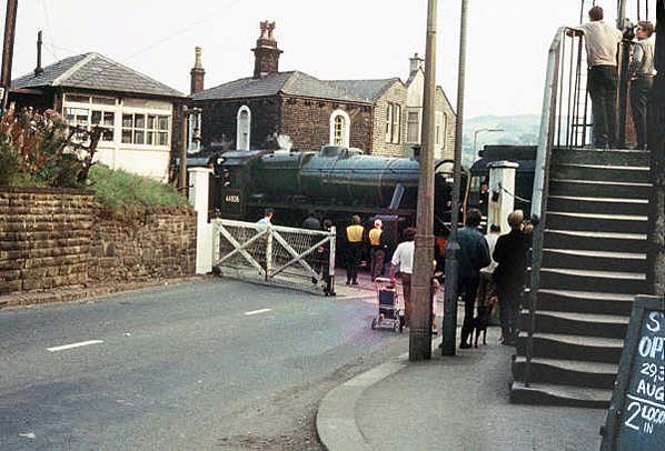 In August 1970 a steam locomotive is hauled by a British Rail diesel into Helmshore station. At this time the station, to the right of the photographer, was in use as a railway museum.