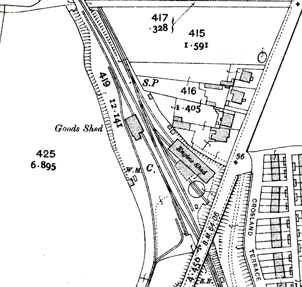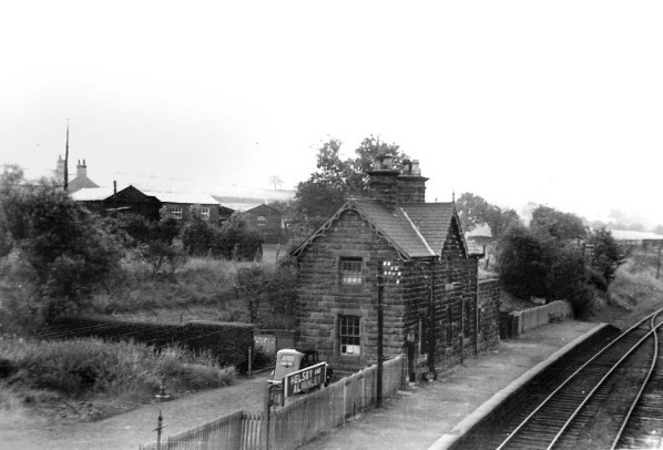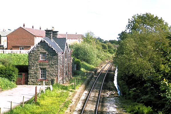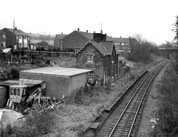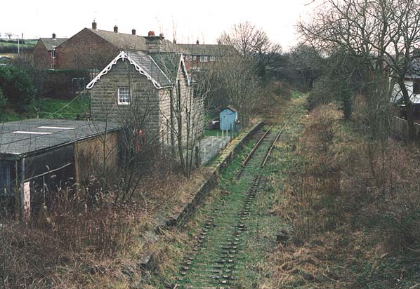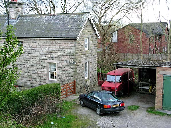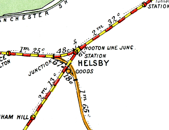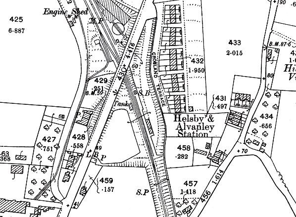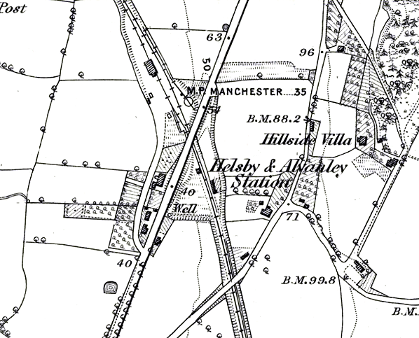 Looking north from the north end of the platform at Helsby & Alvanley station in the early years of the Twentieth Century. The Helsby & Alvanley station signal box that dated from 1889 is clearly shown. Railway employees including station staff, signalmen and a locomotive crew are posing for the photographer. The locomotive appears to be a Charles Reboul Sacré design 'Class 18' 0-6-0 goods engine dating from 1869. Charles Sacré was the chief engineer of the Manchester Sheffield & Lincolnshire Railway from 1858 to 1886. One 'Class 18' locomotive survived into LNER ownership but it was scrapped in 1924. A batch of these locomotives was converted into saddle-tanks during the Great Central Railway and they became Class J28 under the LNER. They had all been withdrawn by 1930. ![]() ![]() When this 6-inch scale map was drawn in 1873 Helsby and Alvanley station was in a sparsely populated and remote area. The goods facilities can be seen to the north of Chester Road. ![]() ![]() Helsby and Alvanley station shown on a 25-inch scale map from 1935. ![]() ![]() Helsby & Alvenley station seen from the air in 1939. The passenger station is seen above the main road and the goods facilities below. The private siding that served the British Insulated Callender's Cables Ltd works can be seen leading off from the goods yard. Copyright photo with permision from the Britain from Above website ![]() Helsby and Alvanley station in the Summer of 1949 still carried its nameboard despite the fact that this was one of the periods when the station was closed to passenger services. In this view looking south the station appears to be remarkably well kept. The occupants of the station house were no doubt eager to keep it in good order. Photo from the John Mann Collection ![]() Helsby & Alvanley station looking south on 31 May 1972. Photo by Keith Holt from the KDH Flickr photostream ![]() A view looking south at Helsby and Alvanley station in January 1980. At this time a steady stream of goods services continued to pass through the station. In particular large quantities of petrochemical products passed along the line and continued to do so until the early 1990s. Photo by John Mann. ![]() The site of Helsby & Alvanley stations goods yard looking north on 17 May 1991. The yard had been to the left of the line the goods shed being at the point where a tractor can be seen. The train was a Freightliner service from Ellesmere Port to Crewe. Photo by Dave Sallery from his Flickr photostream ![]() Helsby & Alvanley station looking south on 4 March 1995 after track lifting had started. Photo by David McGuire from the DMC1947 Flickr photostream ![]()