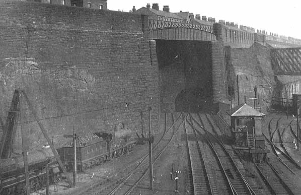 Paul Wright] The view from the footbridge that connected Granby Street to the second Herculaneum Dock station as seen in the 1930s. Granby Street is seen at the top of the photograph. The LOR line can just be seen to the right passing into the Dingle tunnel. Running beneath the footbridge is the CLC Liverpool and Manchester main line which also passes into a tunnel named Dingle. The locomotives seen to the left are standing adjacent to the approach line to Brunswick locomotive shed.