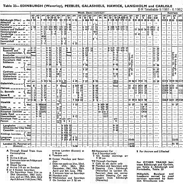 After the end of steam, a variety of diesels worked passenger trains, especially Class 24 and 26 Sulzer-engined diesels, and even Class 17 (Claytons) on local stoppers. Long distance loco-hauled trains were often covered by Class 45 (Peaks). DMUs worked the local services between Galashiels and Edinburgh.