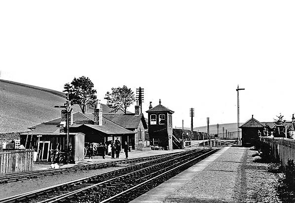 Two miles south of the summit in the 'middle of nowhere' the NBR built what was to become one of the most famous junction stations in Britain in the heart of the Lees Bog. Prior to the railway, apart from a remote shepherd’s bothy, there were no buildings or inhabitants in the area, but the railway brought its own community in the form of Riccarton railway village comprising terraced housing, a shop on the station platform, a school and a three-road engine shed with room for six locomotives; a two-road carriage shed, two signal boxes, a gas plant, turntable and coaling facilities were also provided. At Riccarton, the line made a junction with the Border Counties line extension running through Reedsmouth and Bellingham to the Tyne Valley line at Hexham.