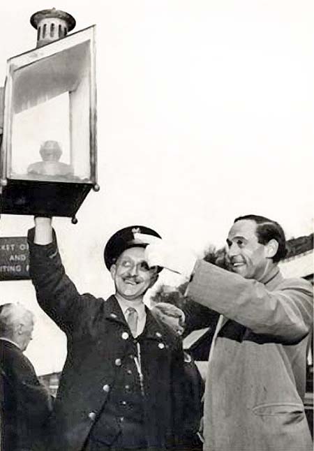 Liberal Leader Jeremy Thorpe is shown an antique paraffin lamp by