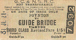 By October 1875 Poynton had six trains in each direction Monday-to-Friday, seven on Saturday and four on Sunday. All of the up trains ran to Macclesfield Central. Most of the down trains ran to Manchester London Road, some via Bredbury and others via Guide Bridge.