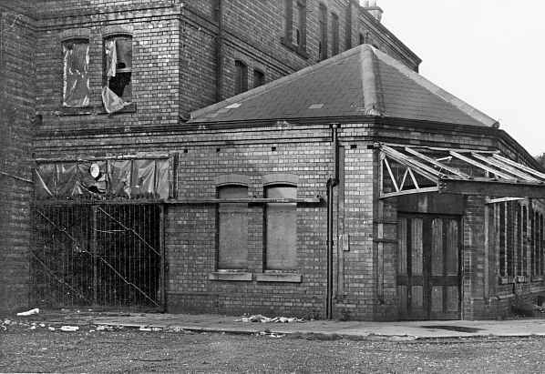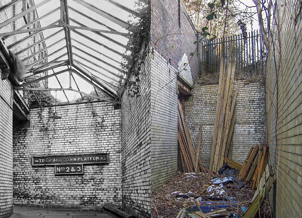 Photo from the Jim Lake collection ![]() When station staff were withdrawn the booking office was boarded up and abandoned, prospective passengers would certainly not been welcomed by the stations appearance. This 1970 picture is certainly synonymous with how all the stations along the route looked at this time. Photo by John Mann ![]() In October 1970 John Mann visited the station to take a series of pictures, one such was of the entrance to the subway. The comparisson shot, to the right, shows how the entrance looked just over 45 years later on 30 January 2016. Note that the location of the large direction board can still be made out on the end wall. Photo's by John Mann and Terry Callaghan ![]() The tired looking running-in-board on October 1970 the up main platform building and canopy are certainly in a state of disrepair. Photo by John Mann ![]() Looking from the up main platform, again in October 1970, in the Wolverhampton direction. The two lines, nearest the photographer, have been out of use for several years at this point hence the heavy rust on the railhead. All lines into the Hockley Goods Yard and warehouses have been lifted. Photo by John Mann To see more pictures of Hockley click here