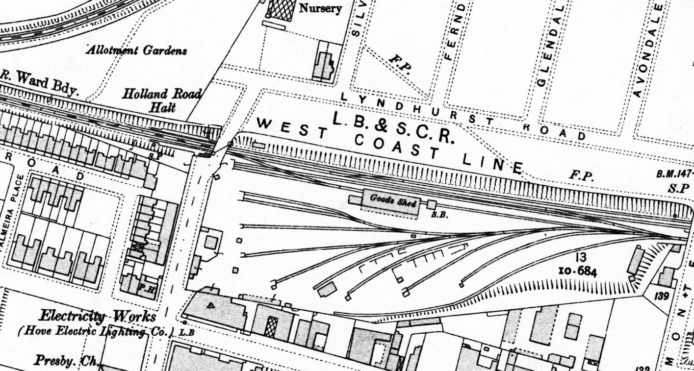 1911 1:2,500 OS map. Holland Road Halt is seen on the west side of Holland Road with Holland Road goods depot on the east side of Holland Road on the site of the original Hove station and goods yard. The Cliftonville Curve is seen top left. A number of new residential roads have been laid out to the north of the line but no housing has yet been built.