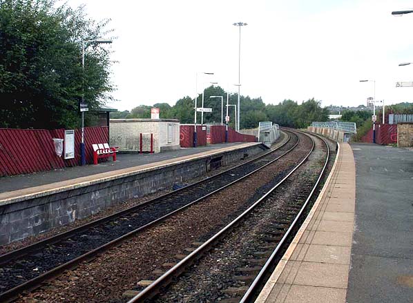 ![]() Looking north along the up platform at Hollinwood station in September 2009. Both of the stations platforms were shortened when the M60 underbridge was constructed. The bridge can be seen just beyond the platforms.