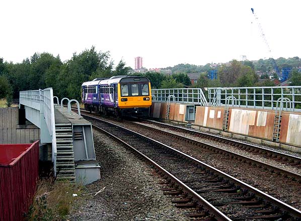 ![]() A Class 142 DMU number 142.013 crosses the M60 bridge at the north end of Hollinwood station in September 2009. The construction of this bridge necessitated the shortening of the north ends of