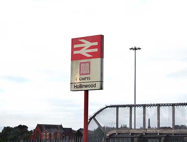 ![]() A Hollinwood station sign near the entrance to the down platform in September 2009.