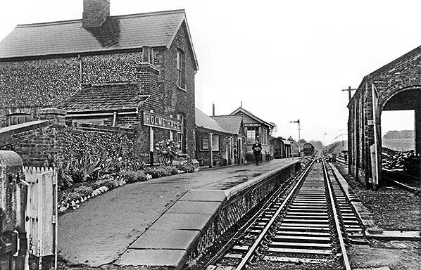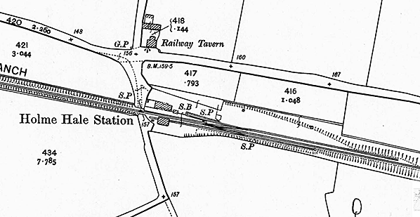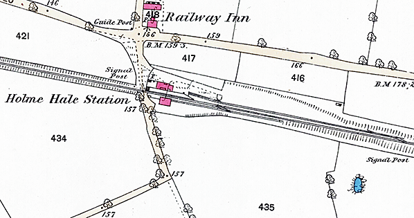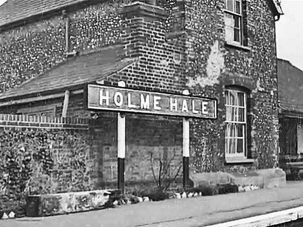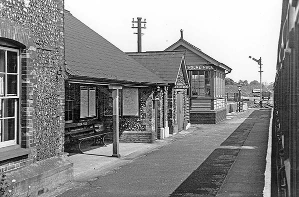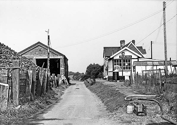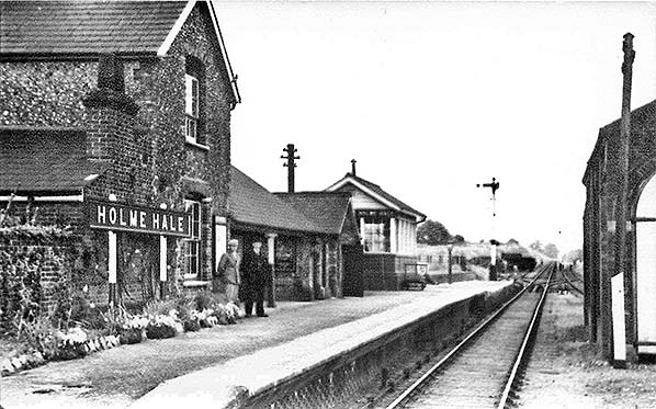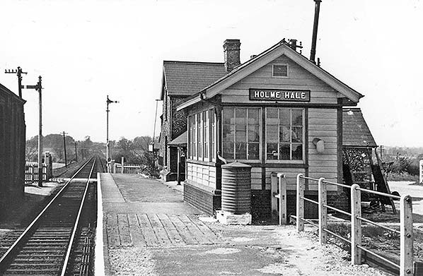The signal box was on the platform to the east of the buildings and some way from the level crossing. There were no points north of the signal box but rods led from the signal box towards the crossing gates suggesting that they interlocked the gates and signals preventing the gates from being opened manually without appropriate signalling. The starter signal for trains towards Watton was on the platform end. There were sidings on both north and south sides of the running line. Access to the goods shed was by use of the siding as a head-shunt. On the 1883 25in OS Map the northerly siding was shown reached from the running line a few hundred yards from the station by way of an east-facing point and trap. By 1905 the layout had been changed and the way into the siding was from the west close to the signal box. There was no facility available for passenger trains to cross one another at Holme Hale. In 1922 the Great Eastern Railway ceased issuing tickets at the station. Passengers obtained their tickets from the guard on the train and this practice continued until closure.
