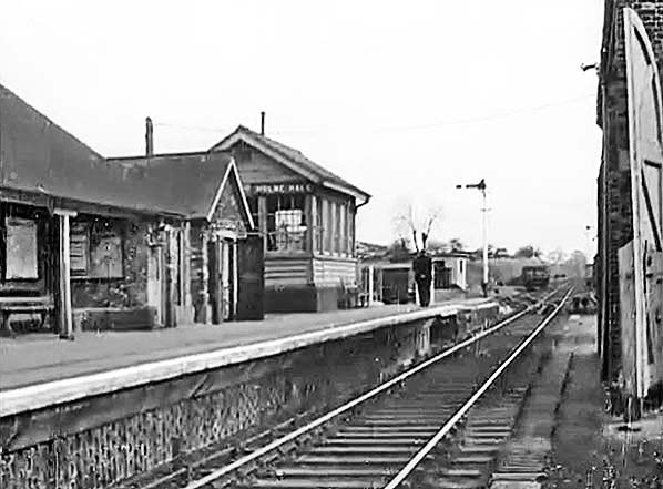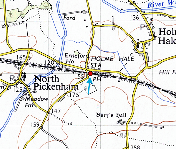 Holme Hale village lies a little under a mile from the station site to the east but there were some dwellings and a tavern by the railway. Kelly’s Directory for 1883 records that George William Smith was stationmaster. In 1896 Frederick James Borrett was in that role but by 1900 Arthur Aldis was in charge of the station. George Jones ran the nearby Railway Tavern and Thos Register was the local coal merchant. The last passenger trains to call at the station ran on 12 June 1964 at 7.23 pm towards Thetford and 9.54 pm for Swaffham and official closure took place two days later. The station continued to handle goods traffic until 19 April 1965.