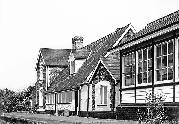The station buildings comprised four sections. Most westerly was a single-storey annexe to the main two-storey building. Both had their roof-line at 90deg to the running line with their gable ends onto the platform. The annexe boasted a large two-flue chimney directly behind the station nameboard on the platform. A basic shelter was formed under the overall roof of the next part of the structure, this with its roof-line parallel with the platform edge. The roof over the shelter was supported by a cast or carved column. A gents' toilet occupied the east end of the building. Finally, a single-storey shed opened onto the platform. The main building was constructed of local Norfolk flint whilst the annexe and shed were of brick. All had slate roofs.