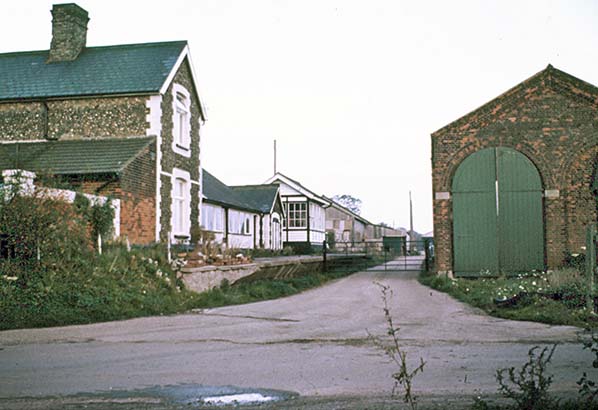 Notes: Holme Hale station had a single platform on the north side of the running line. The platform lay on a roughly east-west axis, the line from Thetford having taken a long curved route to the west from its north-south path at Watton. There was a level crossing, probably operated manually rather than from the signal box, over Brown’s Lane at the western (Swaffham) end of the platform. A single-line goods shed was opposite the platform with its entrance facing east.