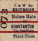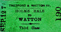 As regards tickets issued for travel, Mr T C F Vollacott wrote a short history of the two railways. He asserted that he did not know whether the Watton and Swaffham company had ever issued its own style of ticket: all that he found bear the name of the working company. Several distinct ticket types were issued: all were standard ‘Edmondson’ size. 1st Class singles were white, 2nd rose, 3rd green and ‘parliamentary’ buff coloured. 3rd class returns were green and buff. Early tickets had serial number and date on the face, right and left sides respectively: later ones had the serial number twice on the face and the date on the back.