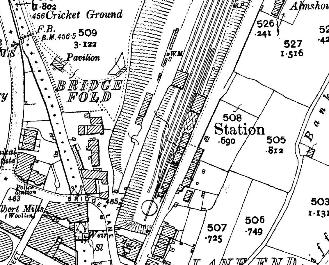 1906 1: 2,500 OS map. This map shows the glazed platform roofing in front of the station building and extending northwards as far as the ‘tranship’ shed. The rails have been removed from the bay platform, over which the roofing extends.