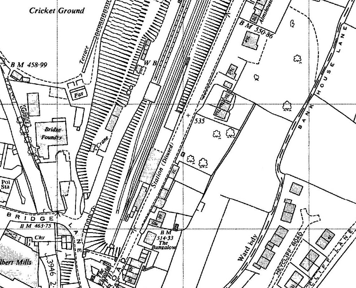 1966 1: 2,500 OS map. The station is shown as ‘Disused’, but the rails, platform and buildings are in place. The signal box and turntable have been removed, but an additional crane is marked on the approach to the goods yard..