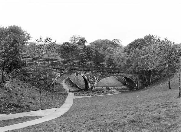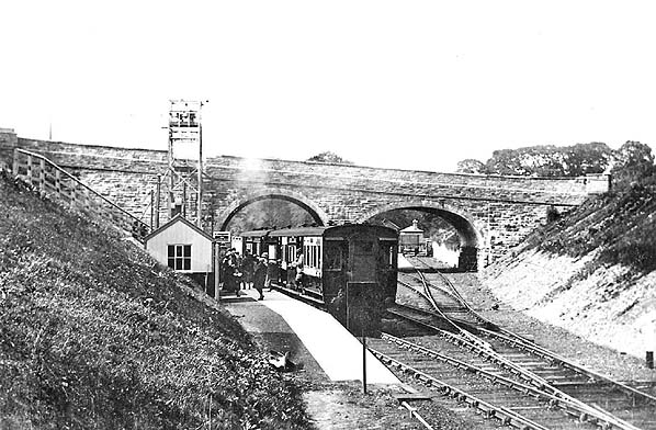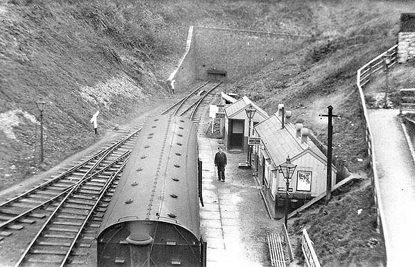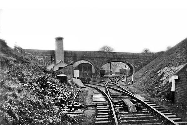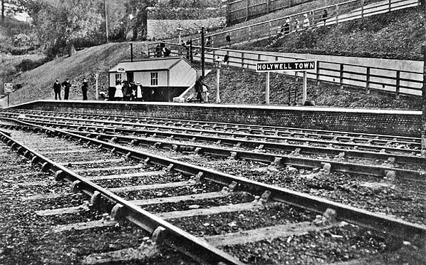 Looking north-west from the buffer stops at the southern end of the Holywell Town branch in 1932. Holywell Town passenger station can be seen to the left. At the far end of the platform is the lift that was installed in 1913. The goods yard can be seen through the left archway.