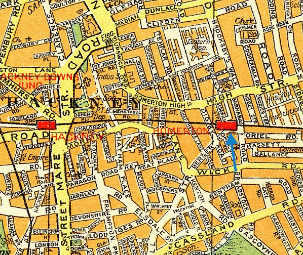 Primrose Hill, Hampstead Road, Camden Town (1st site), Maiden Lane, Barnsbury, Canonbury, Mildmay Park, Kingsland, Hackney (1st site), Hackney (2nd site), Victoria Park (1st site), Victoria Park (2nd site), Old Ford, Bow, South Bromley, Poplar East India Road, Dalston Junction, Haggerston, Shoreditch & Broad Street
