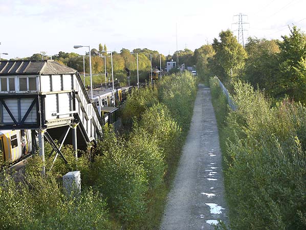 Looking south from the Hooton Road overbridge in October 2009. The crushed stone path marks the site of the West Kirby branch. To the left would have been Hooton Station's platform 6 and to the right platform 7 both of which were used by West Kirby Branch trains. To the left of the picture can be seen the covered footbridge that once continued over to platform 7. The former platforms 4 and 5 are now the stations only platforms that are in frequent use as they serve the Merseyrail Wirral lines to Chester and to Ellesmere Port.