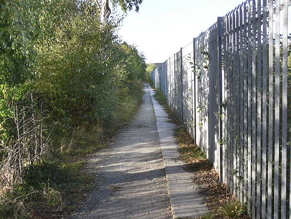 Looking north along the former Hooton Platform 7 in October 2009. The flags that marked the platform edge are still extant. The Wirral Country Park path runs along the platform. The steel railings have been set into the platform edge spoiling what would otherwise be a pleasant view.