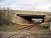 Hopperton station, looking east from a Harrogate-bound train in June 1973. The station closed to passengers in 1958 and to goods in 1962, and since 1967 the station building has been privately owned. The ramp of the old cattle dock is seen in the left foreground. The level crossing, formerly used by the A1 road, is now used only by farm vehicles, and the road has been diverted over the modern bridge. The up (York-bound) platform was immediately beyond the level crossing. Six months after this photograph was taken, single-line working would be introduced between Cattal and Knaresborough, with up track removed by 3 March 1974.