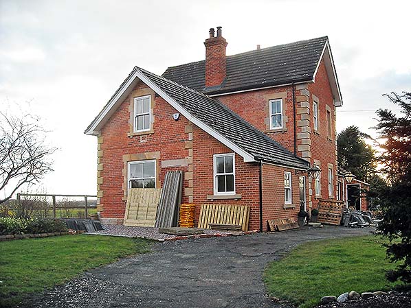 Hopperton station building looking west in April 2016. The owners of the building have carried out much work to restore the exterior to something approaching its original condition. Some changes have been made, including the addition of the closest section of the building, but this has been constructed of brick closely matching the colour of the main structure, and the roofline extends sensitively over the extension. The York-Harrogate trains still pass the opposite side of the building, beyond the fence to the left.