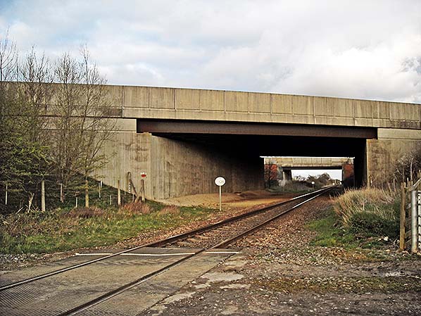 Looking east at Hopperton station in April 2016. The viewpoint is close to that used by Peter Sunderland in May 1959, and the contrast is enormous. The line through the station was singled in 1973-74. The down platform, on the far side of the line, was demolished by 1969. The level crossing in the foreground, used by the A1 road in 1959, now accommodates a farm track. The more distant of the two large bridges was opened on 25 June 1962 for the diverted A1, allowing traffic to flow freely without the obstruction of the level crossing. This road over this bridge has recently been reclassified as the A168, because the A1 (now upgraded to motorway status) follows a new route over the