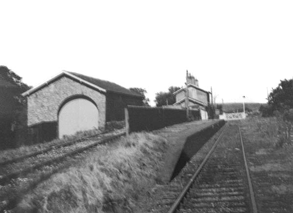Hovingham Spa Station looking north west in the 1950's. The coal drops are behind the wall at the back of the platform. The original goods shed is seen on the left.