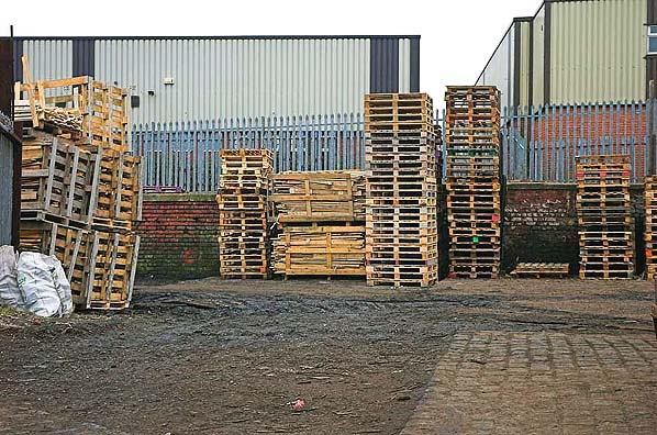 Looking through the locked gates of the NER building in February 2006 showing the railway boundary wall at the rear of the yard. Photo by Mark Dyson