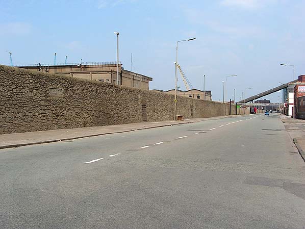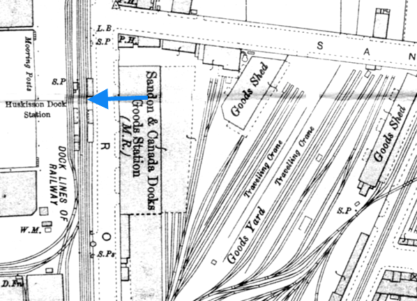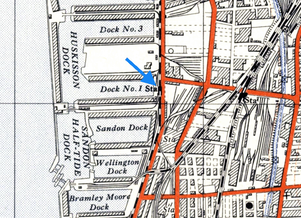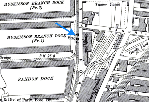 Huskisson Dock was located to the east of its namesake on the western side of Regent Road close to the point where it has its junction with Sandhills Lane. On the east side of the road was the Sandon & Canada Goods Station of the Midland Railway which had opened on 2 June 1873. The LOR ran within the dock estate at Huskisson behind a large stone wall. Access to the station for the public was via a doorway cut into the wall at each end of the station. Beyond the doorways there were steps that led up to the platforms.