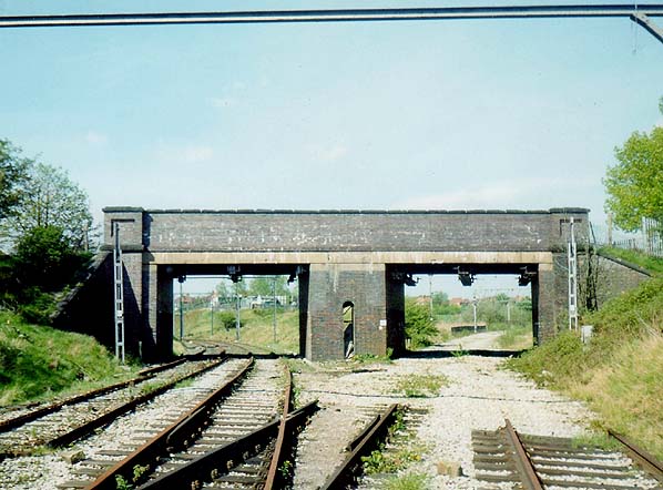 ![]() Hyde Road Junction, 500 yards north of Hyde Road station in May 1991. This was the junction that provided links to Gorton and to Fairfield. The Fairfield line which was used by the passenger services that ran until 1958 ran to the right of the picture and by this date it has been lifted. This section of the line was used for a demonstration of the Metrolink which Manchester was planning to build at the time. As a result the line was re-electrified at 750V DC and a Docklands Light Rail vehicle was fitted with a pantograph. As the Manchester-Hadfield mainline had recently been converted to 25kV AC a Class 306 EMU was positioned under the right side of the bridge to act as a transformer/rectifier! Photo from Closed South Manchester Railways web site |