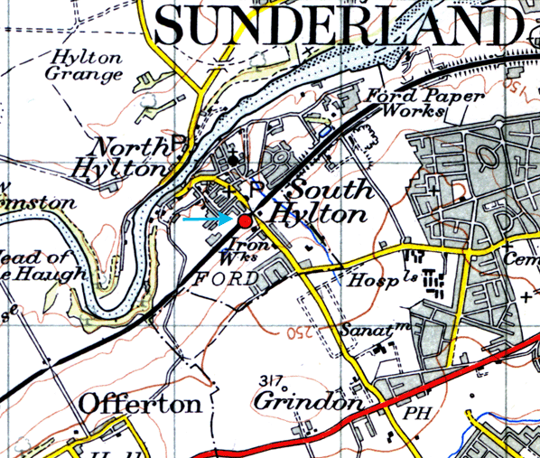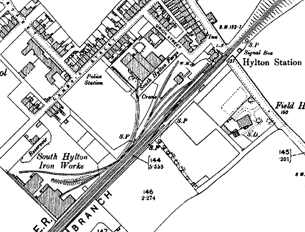 When the railway opened the immediate surroundings of Hylton were rural, but the village lay in the ‘Great Northern’ coalfield and the prosperous docks and port facilities of Sunderland were only a couple of miles to the east. By the 1870s South Hylton ironworks, south-west of the station, was reached by a short branch off the railway. By the end of the nineteenth century more housing had been built north of the station, and a goods yard had been developed behind the down platform, with four sidings including a loop. A goods shed and three-ton crane were provided, and a branch served South Hylton Forge.