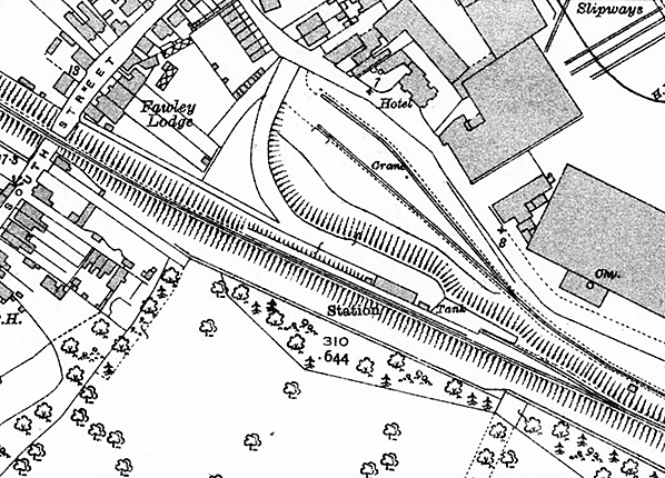 Photo from Waterside Heritage ![]() ![]() 1932 1:2,500 OS map shows the layout of the station as built. The station is along a short approach road off Shore Road. The station building is towards the east end of the platform with a water tank to the rear of the platform just east of the building. A single siding serving a cattle dock is seen to the east of the station. The goods yard is clearly at a lower level at the bottom of an embankment behind the station. There are two diverging sidings with the 10-ton yard crane standing between them. The grounded van body is seen at the end of one of the sidings. The large building on the right is the Supermarine seaplane assembly factory. Langdown Park is seen at the bottom of the maps; the railway cut through the northern edge of the park. The large hotel opposite the goods yard predates the railway.