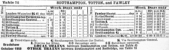 just be seen Photo by JH Aston ![]() Photo from Waterside Heritage ![]() On 3 June 1960 and photographed from an unusual vantage point, a passenger train seemingly departs Hythe for Totton and probably Southampton Central. South Street bridge is just behind the camera. The pilot (leading) is Class H16 4-6-2T No.30516. The train engine (the usual term rather than 'train locomotive') is identified only as a BR Standard 2-6-2T. Precisely what is going on needs a little detective work to determine. The train will not have required two locomotives and the H16 may be working back, probably to Eastleigh, having worked to Fawley earlier in the day with a tank train. Returning light locomotives ('light' means a locomotive running on its own) to depot by this means was and is common practice as it saves a path (basically a slot in the working timetable). Alternatively and more likely, the lack of any under-power exhaust, the faint whiff of smoke from the H16 drifting straight upwards and the crispness of the photograph suggest the train is stationary. This implies the 2-6-2T had failed and the H16 sent down the line to rescue it. The headcode disc on the bunkers of both locomotives might support this theory. The train is a Bulleid 3-set and it appears to be No.784. Assuming this to be correct, this set comprised BSK S4327S + CK S5764S + BSK S4328S. It was one of a large batch of 3-sets allocated to Waterloo - Weymouth/West of England routes and which in 1960 ran from set 770 to set 793, all being formed new in 1947. They were used on local and branch services, as here, or for strengthening other sets at busy times. They could be seen as far west as Padstow and their formation with a brake at each end was useful for the ‘Atlantic Coast Express’ which joined and divided along the way in order to serve various locations, perhaps most famously at Halwill where portions for Bude and Padstow divided and joined.