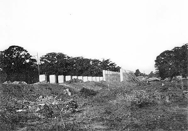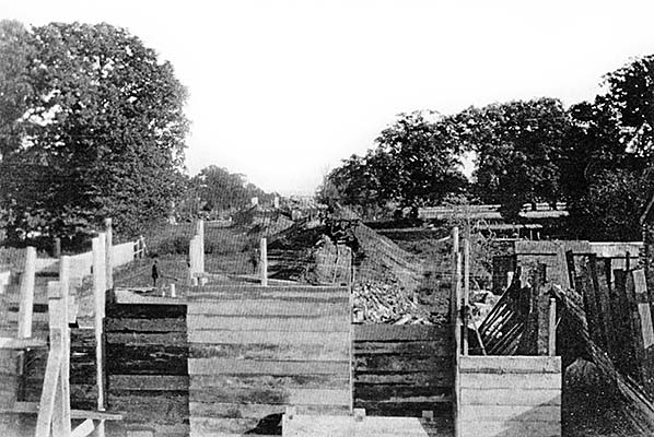 ![]() Hythe Station foundations under construction in 1924 looking towards South Street. The columns on the right would be capped with a concrete slab to support the station building. The lower row on the left, which appear to be only partially completed would support the outer edge of the platform. They were probably wider to take the sideways pressure from the embankment.